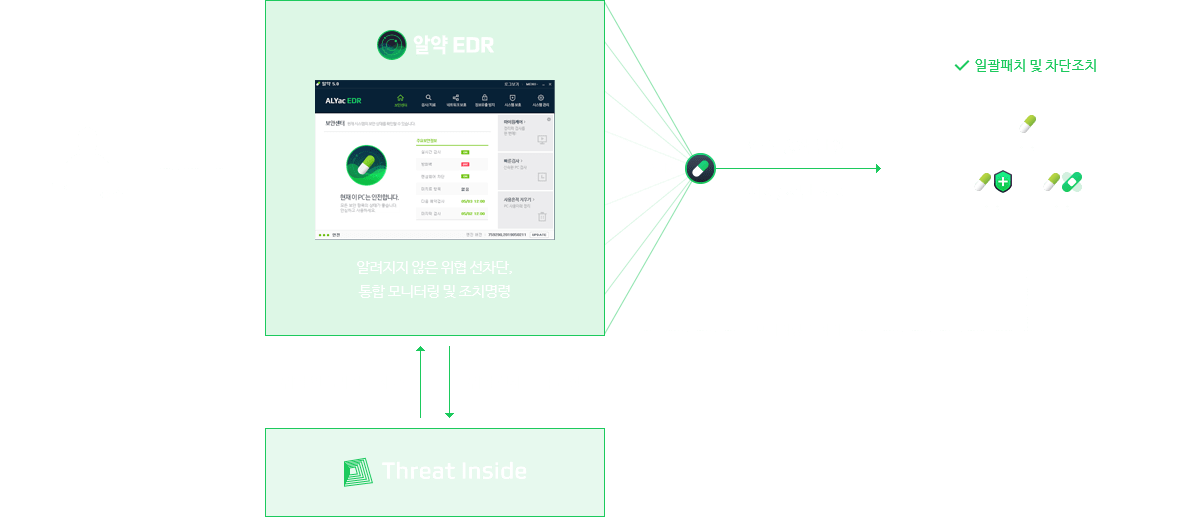 이스트시큐리티 알약 EDR은 알려지지 않은 위협을 선차단하며, 중앙 관리 콘솔 ASM을 통해 전사 엔드포인트 기기들을 한눈에 모니터링 할 수 있습니다. 또한 백신 알약, 알약 패치관리(PMS), 알약 내PC지키미 등 엔드포인트 보안 솔루션에 일괄 정책을 통해 조치명령을 내릴 수 있어 통합 관리가 가능하며, Threat Inside와의 연동으로 상세한 위협 인텔리전스도 확인할 수 있습니다.
