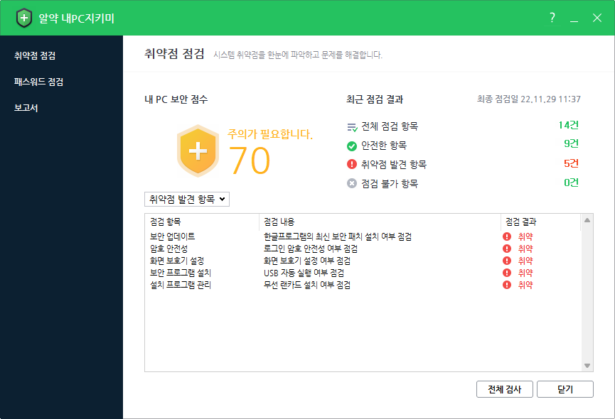 - 보안 점수를 통해 사용자 스스로 PC 취약 여부에 대해 인지