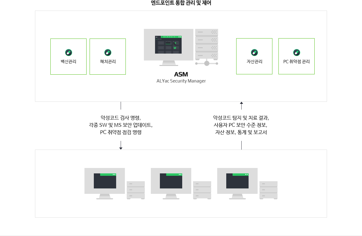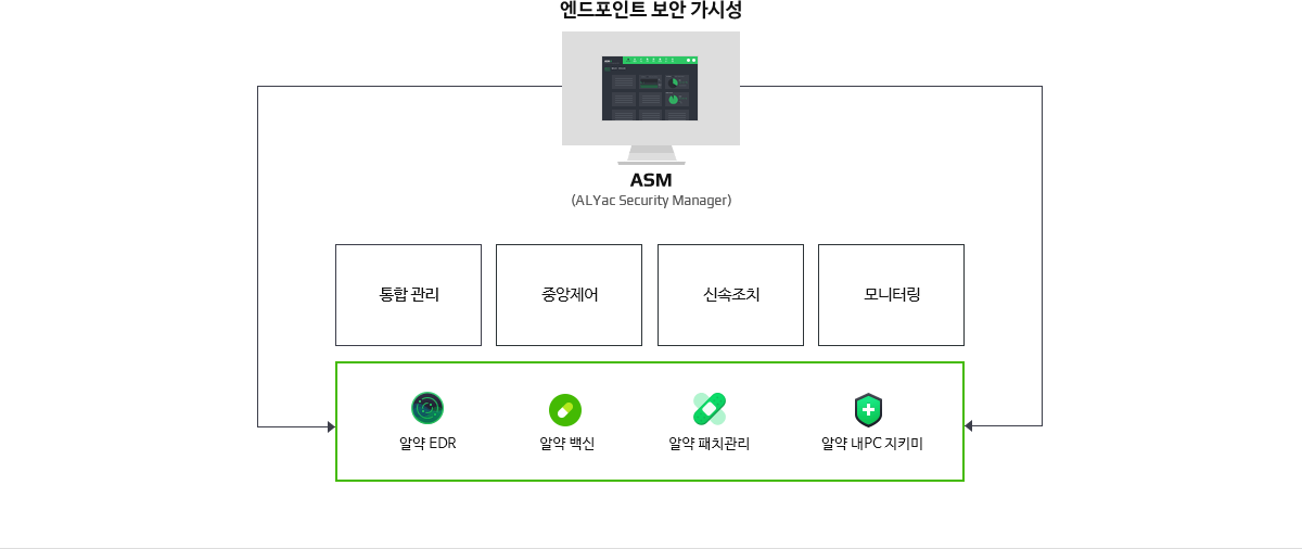 ASM(ALYac Security Manager)은 관리자가 기업 내 알약 제품군이 설치된 PC에 대한 통합적인 보안 관리 및 자산관리, 보안 정책 적용을 수행하도록 하는 통합 중앙 관리 솔루션입니다.
