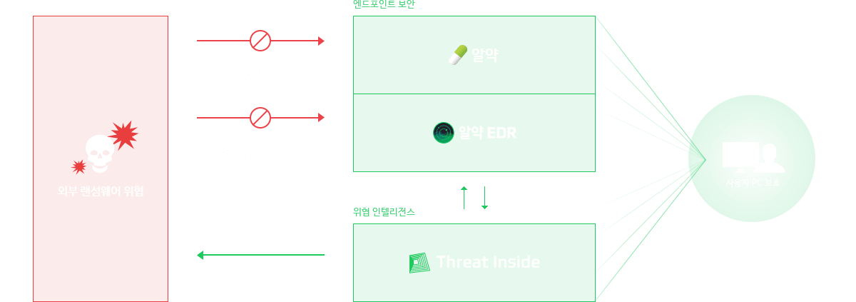 Threat Inside를 통해 분석된 정보는 알약 EDR을 통해 이스트시큐리티의 엔드포인트 제품군에 반영되어 신, 변종 랜섬웨어를 차단합니다.