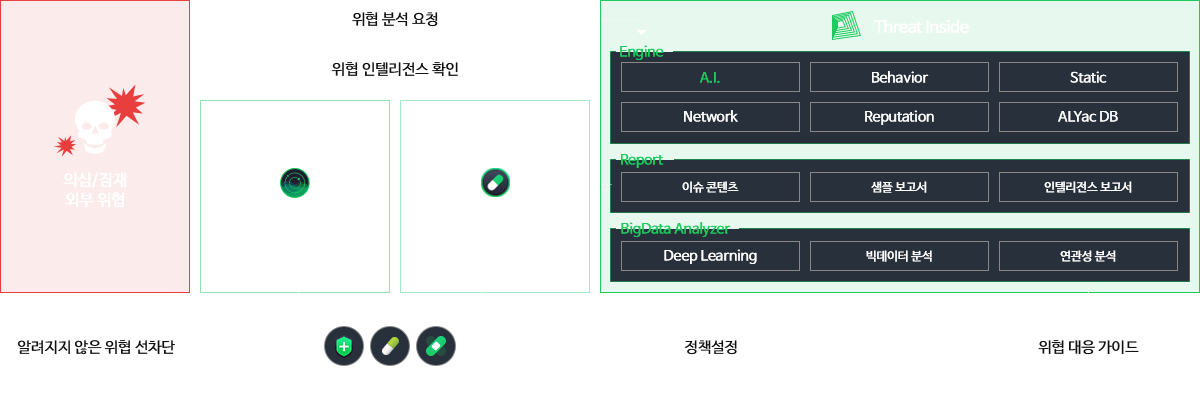Threat Inside의 분석정보들은 알약 EDR을 통해 이스트시큐리티의 엔드포인트 보안 솔루션에 반영되어 알려지지 않은 위협을 신속히 차단하고 신/변종 위협에 빠르게 조치하도록 돕습니다.