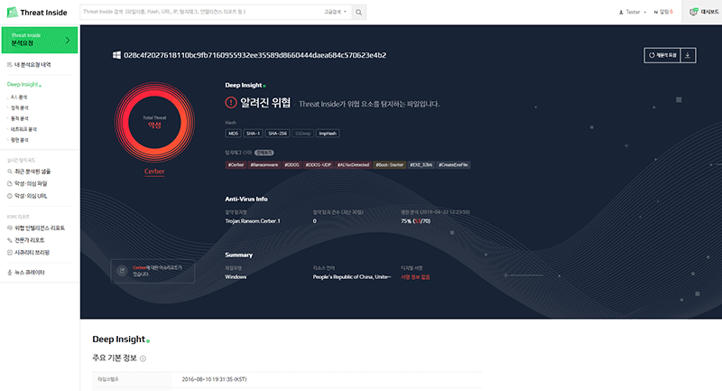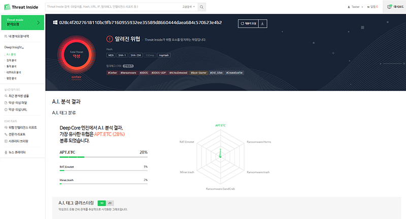 정적, 동적 분석 등 다양한 분석기법을 통해 공격자의 IP 주소, 국가 등 악성코드 위협을 상세 분석하여 공격의 추적을 돕고, 유사 위협에 대한 대응 가이드를 제공하여 실효적으로 예방할 수 있어야 합니다.