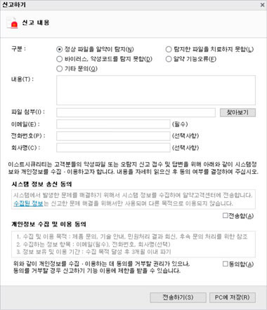 - 알약 프로그램 > 메인 상단 메뉴 > 신고하기